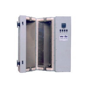 Быстрый срабатывающий нагревательный элемент расположен на задней стенке камеры за нагнетающим вентилятором. Поток нагретого воздуха направляется по специальному воздуховоду через верхнюю и нижнюю части камеры к её центру.